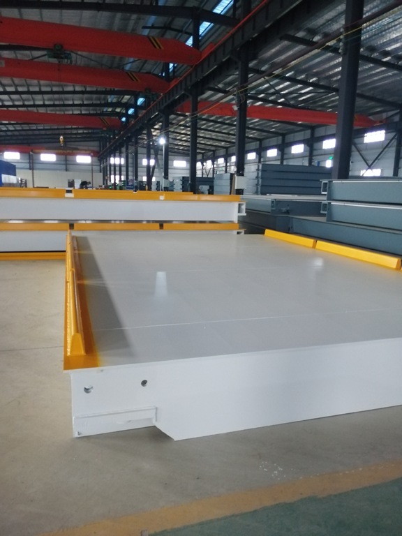 汽車衡面板采用自動(dòng)埋弧焊機(jī)拼焊,采用全自動(dòng)多頭氣體保護(hù)焊機(jī)進(jìn)行滿焊,秤體端板經(jīng)過技術(shù)人員刻苦公關(guān)采用平焊焊接,避免立焊焊接的人為因素,確保焊接質(zhì)量。具備專用的預(yù)反拱設(shè)備和工藝規(guī)程保證焊接質(zhì)量。